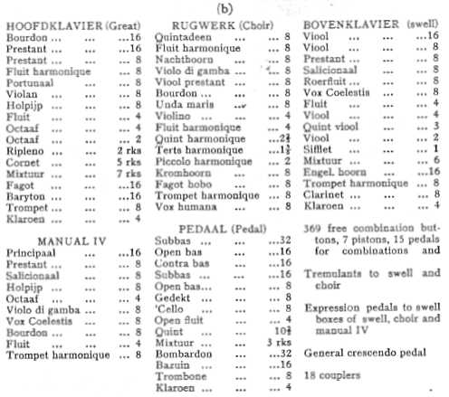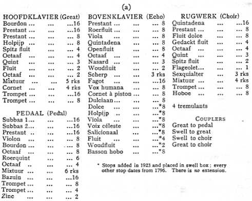this music may be alone justified by its undeniable merit. It is to be feared that scientific progress (?) has been allowed to domineer rather than to aid a great many crafts in some countries, including England and America. Such is not the case -at any rate to any undesirable degree- in Holland: many magnificent examples of the great seventeenth and eighteenth century school of Dutch organ builders 2 to be seen and heard to-day all over the Netherlands have, therefore, escaped the bugbear of over-modernisation. Renovations, re-builds, and repairs have been carried out in such a way as to ensure preservation of the wonderful old pipework and voicing. But it must be admitted that many large organs in Holland to-day fall rather short of perfection when viewed from the points of mechanical efficiency and console comfort; yet what joy there is in playing on one of these marvellous old instruments built in a bygone age by artists for art's sake, and in the realisation of the seeming existence of a very soul within the frequently beautiful exterior case. Mere words cannot describe my feelings on hearing one of these old masterpieces of their creator's art played by a master player. At the same time, however, I do not wish to convey the impression that modern organs do not exist in Holland: such is far from the case. Standaart of Rotterdam, De Koff of Utrecht, and Van Leeuwen of Leiderdorp are some of the leading present-day Dutch builders responsible for many fine specimens of their craft incorporating such modern ideas as tend to aid the player, and in which may be observed most commendable efforts to carry on the fine old traditions of the earlier school. |